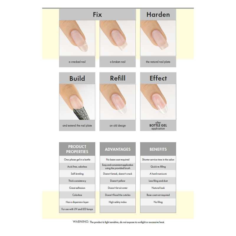 Användningssätt: Applicera gelén på den naturlig nagelplattan och härda i UV-LED eller LED-lampa i 60 sekunder.